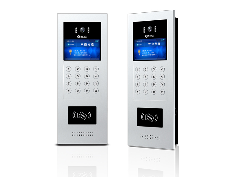 功能特点: ● 银色拉丝铝合金,高光金属按键; ● 4.3英寸高清数字屏,图文菜单显示,语音提示; ● 标配IC门禁、手机密码开门功能; ● 单元门口机及小区围墙机可自主设置; ● 出厂默认通过PC平台下发IC卡; ● PC实时显示刷卡及人脸抓拍等开锁记录; ● 可通过PC管理平台进行IC卡数据备份及还原 ; ● 支持本机通过键盘添加/删除IC卡 ; ● 支持PC中心远程升级及本地升级; ● 支持通过 RS-485接口,联接M5读卡器,并上传PC相应刷卡记录; ● 支持防拆报警、门磁报警、消防报警;
